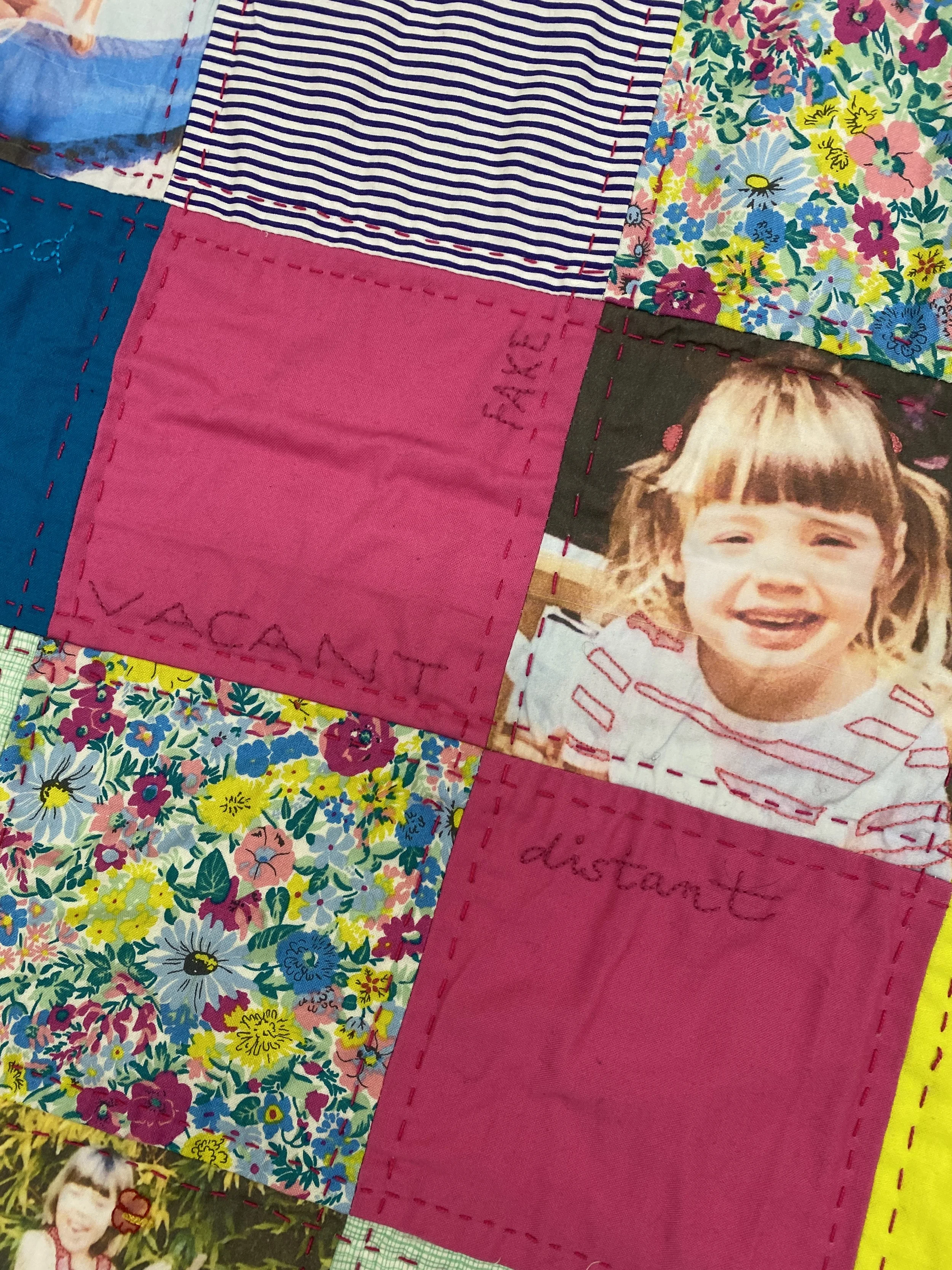 Through a feminist lens, I examine how textiles can be a vehicle for remembering, memorialising, and agitating, while new materialism removes the hierarchy between artists and materials. My artistic interventions concern domestic scenes and the contradictions around home, sites of safety and comfort for many, but loci of abuse for others. Distorted images and traditional motifs, accompanied by childhood photographs, absent memories and text are captured in my textile works, evoking the tradition of embroidery samplers and quilts, methods originally used by women to develop proficiency, share stories, and generate change.